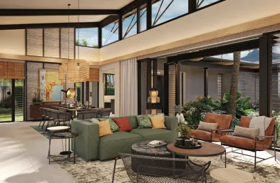 Set at the edge of the seaside village of Black River, this eco-conscious villa offers a private retreat where nature, light and ocean living come together in perfect harmony. Surrounded by lush endemic vegetation and framed by open views of the golf course and the sea, the villa enjoys a privileged West Coast setting between majestic mountains and a crystal-clear lagoon. Designed around a spacious central courtyard, the villa embraces a seamless indoor–outdoor lifestyle. The courtyard provides a sheltered and intimate space to enjoy warm summer afternoons and spectacular sunsets, while the villa’s ideal orientation ensures protection from prevailing winds and an abundance of beautiful natural light throughout the living areas. Thoughtfully planned to offer both comfort and privacy, the villa opens onto panoramic vistas stretching across the golf course to the ocean beyond. A dedicated boat park nearby offers secure parking and a convenient launching area for boats, making it easy to embark on unforgettable sea-bound adventures along the West Coast. A true haven of tranquility, this villa is an invitation to slow down, reconnect and embrace a refined tropical lifestyle in one of Black River’s most desirable coastal settings.