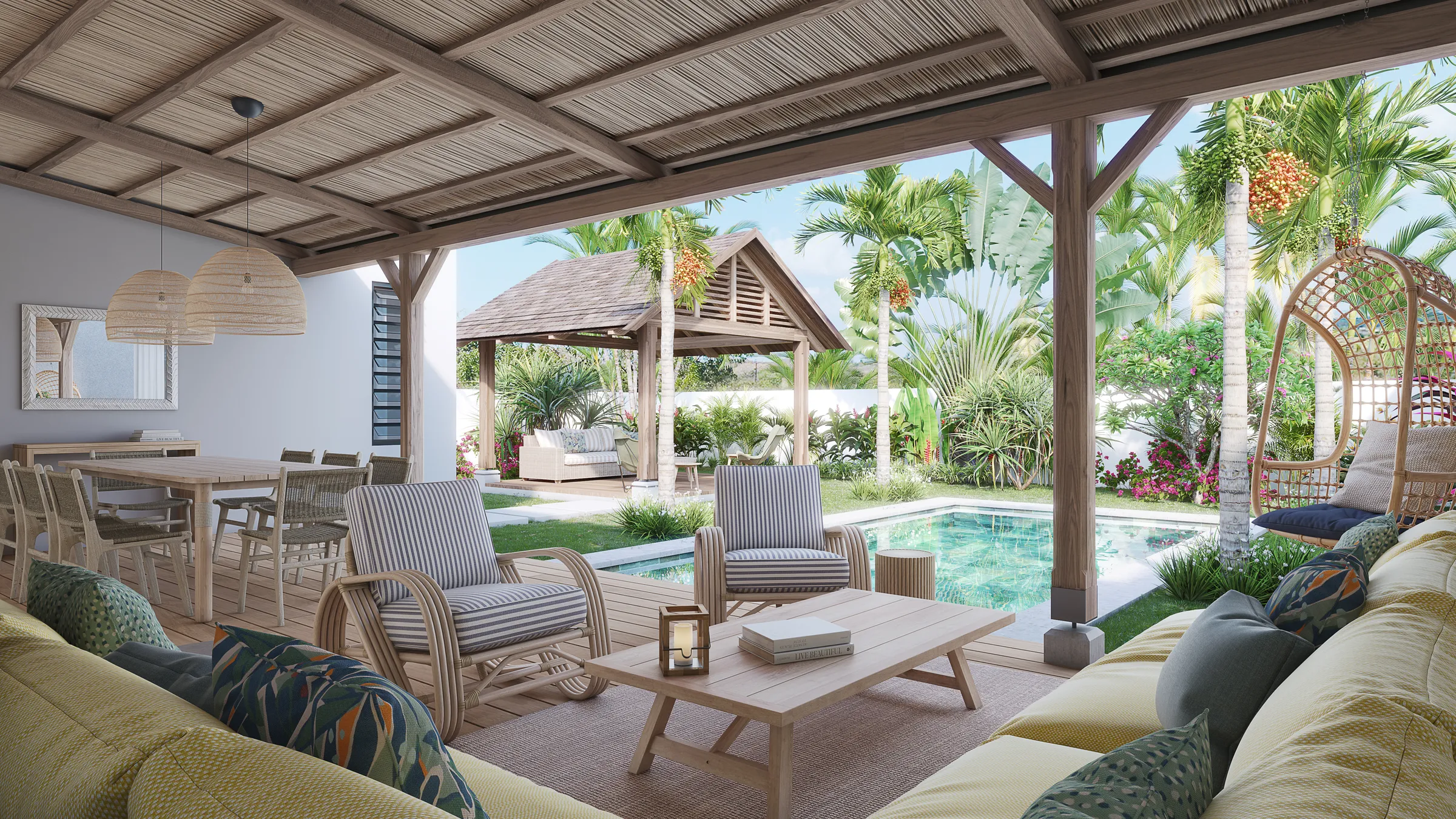 Nestled within an intimate residence of only 16 properties, this beautiful villa offers an ideal location close to the most stunning beaches in the north of the island, as well as all essential amenities. Perfectly laid out, the villa features three en-suite bedrooms, ensuring comfort and privacy for all occupants. The spacious living area, enhanced by its impressive high ceilings, opens onto a large covered terrace, creating a seamless indoor-outdoor living experience. Designed to embrace a true tropical lifestyle, the property is set within a lush, landscaped garden complete with a swimming pool, a pergola, and a private parking area for two cars. The generous outdoor space also offers the potential to build a separate dependency, ideal as a fourth additional bedroom. The residence further benefits from shared green spaces, including a clubhouse and a fully equipped gym, providing a relaxed and convivial living environment. This villa represents a wonderful opportunity to enjoy comfort, style, and tropical charm in a sought-after location.